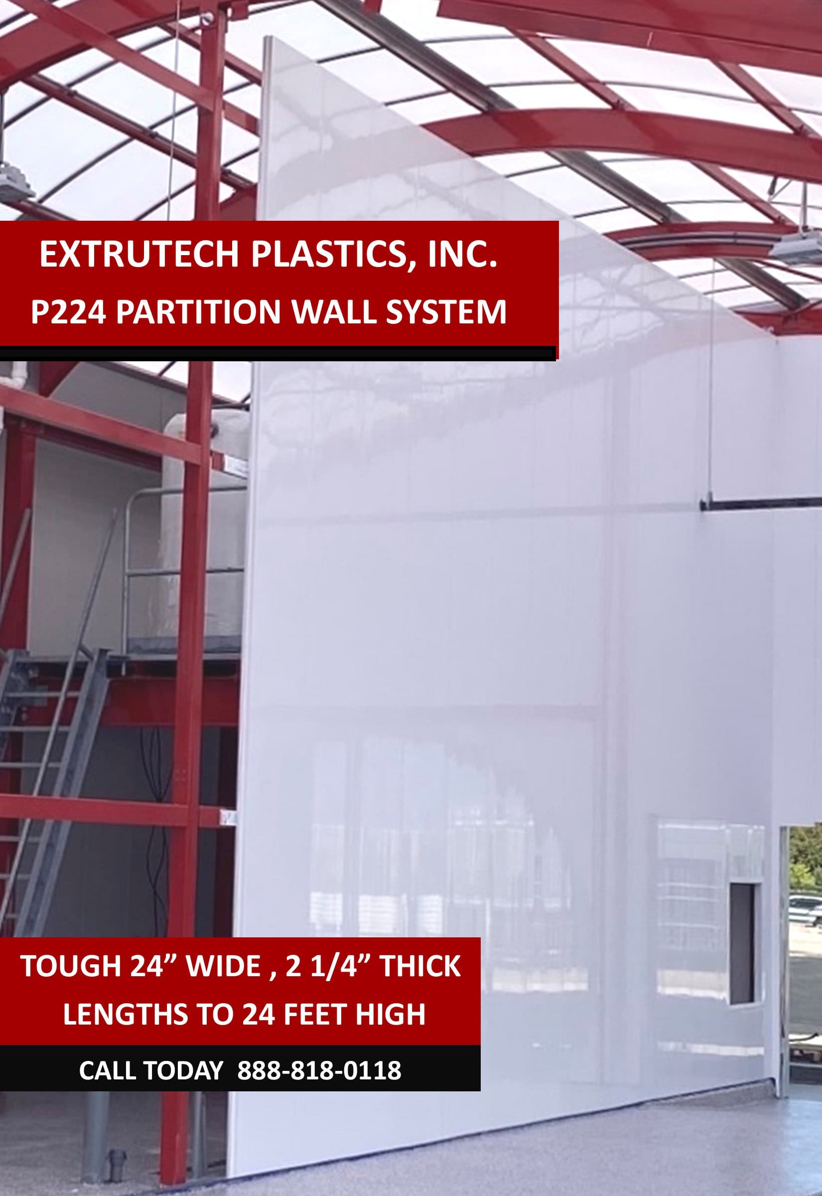 Extrutech P224 Demountable Partition Wall Panel with its bright white smooth, non-porous finish allows numerous design options. Perfect for partition walls in high-moisture environments such as Car Washes, and limiting cross contamination in Food Processing, and Bottling Plants and many other industries. With a wall thickness of 2 1/4” which allows for insulation and internal steel support. Cut to the inch panel lengths or based on your requirements, with door and window cut-out options. This user-friendly panel also allows for easy field cuts and its tongue and groove edge design makes for quick installation. See our video below for step-by-step installation or click here to view. Email or call us at 888.818.0118 today for a quote or any questions you have on our P224 partition wall panel system.